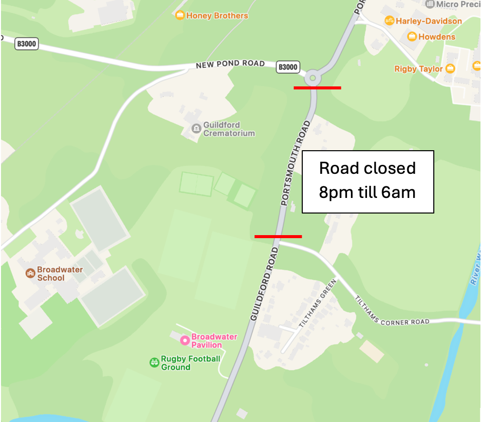 The A3100 road south of the roundabout at New Pond Road and the junction with Tilthams Corner Road, will be closed.